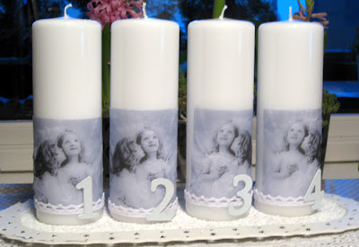 I går fikk jeg laga meg adventsstaken for i år. Jeg har klippet ut englene fra en serviett fra Sagen design. To av motivene var speilvendte, noe jeg synes ble fint når lysene ble oppstilt. Jeg har kjøpt meg varmepistol og fikk testa den for første gang på disse lysa. Talla er kjøpt på Kremmerhuset og blonden hadde jeg liggende. Fatet er fra Sia.
